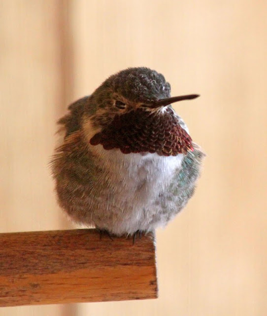 This little hummingbird had been taking shelter under our front porch when some snow arrived on Thursday. He was parked right next to a feeder and let me take his picture. Isn’t he cute?