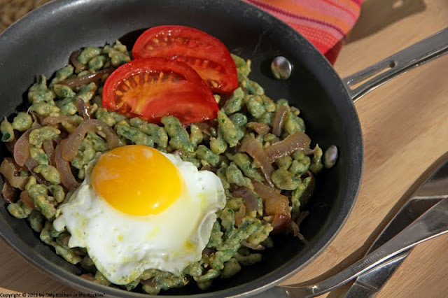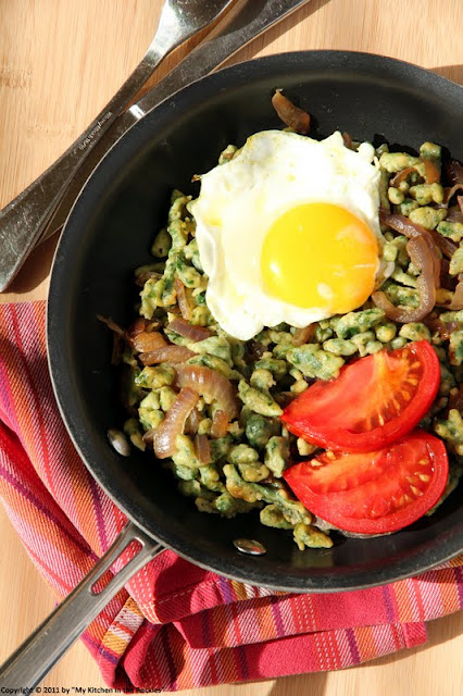 Kirsten-I use the same basic recipe for my spaetzle, but never tried to make it with spinach…although I did stir chopped parsley, or dill in it. Spinach sound great, and especially using the fried egg on top for a nice brunch. Yummm!
