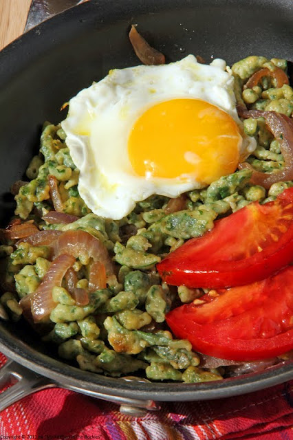 I am one of those who voted for German recipes, so thank you! I love spaetzle but I have never had them like this, with eggs and onion and tomato. Looks really good.