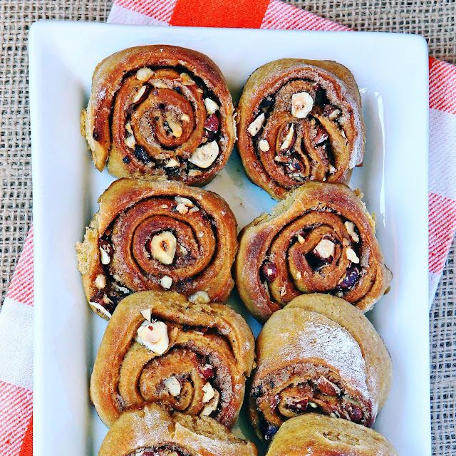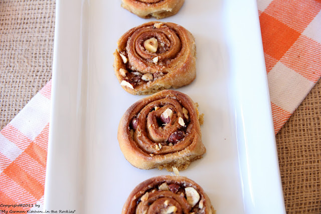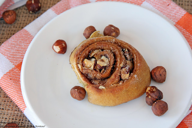 Sprinkle with the sugar mixture and hazelnuts. Roll into a 20 inch log. Slice the roll into 15 slices. Place the slices in a greased 9×13 pan or two 9 inch cake pans. Repeat with the other half of dough.