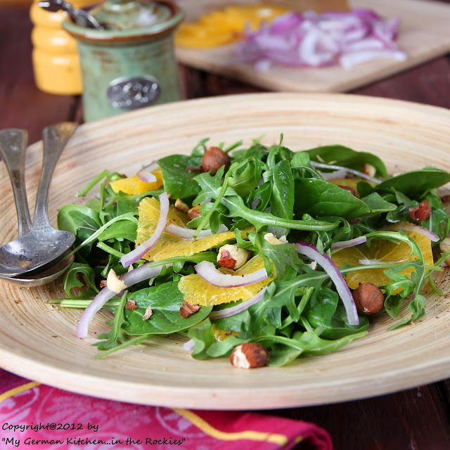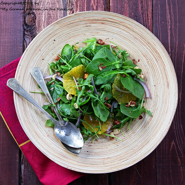Here are my very best wishes to you my friends and readers with a fresh and healthy orange-spinach-arugula salad. The salad is served with tasty apricot vinaigrette and topped with toasted crunchy hazelnuts.