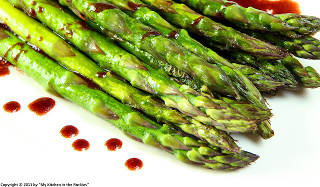Here I am serving the roasted asparagus with vinaigrette made out of pomegranate molasses, aged balsamic vinegar and a good organic olive oil. A healthy and quick side dish that goes impeccably well with grilled chicken or steak.